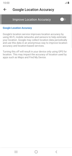 Press the indicator next to "Improve Location Accuracy" to turn off the function. If you turn off the function, your phone can find your exact position using the GPS satellites but it may take longer as there is no access to supplementary information from the mobile network or nearby Wi-Fi networks.