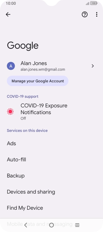 Selecting settings for Find My Device